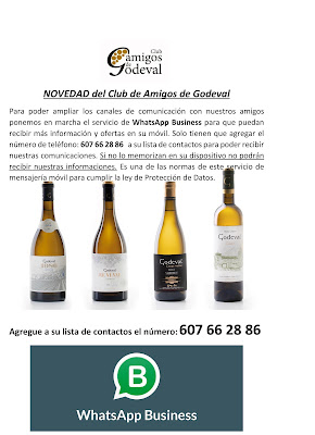 En estos días los miembros del Club de Amigos de Godeval recibirán la carta en la que se les notifica que la añada 2019 ya está lista para ser enviada a sus domicilios. Este año además de las nuevas ofertas SuperClub también reciben la notificación de que un nuevo servicio está activo para ellos. Se trata de la aplicación WhatsApp Empresas que nos permite mantener contacto con los socios del Club de una forma más rápida y directa. El único requisito para recibir nuestras notificaciones es memorizar en los contactos de sus teléfonos el número de la bodega. El teléfono a guardar es el 607662886 y a través de él podrán hacer sus pedidos y recibir información sobre la bodega.